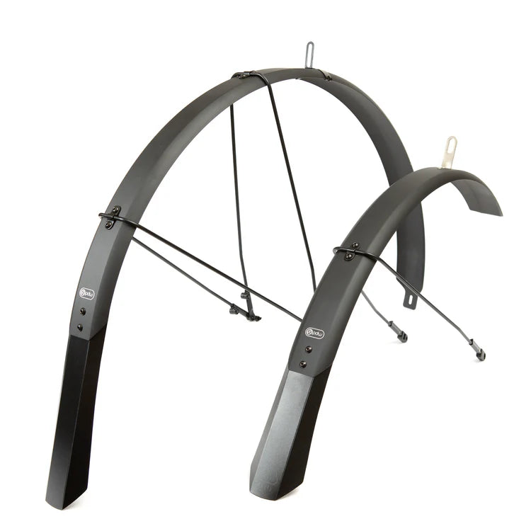 Serious wet climate riders from Portland to London to Tokyo trust the Full Metal Fenders because they're quiet, durable, and look great on any bike. Made of sturdy anodized aluminum and adorned with laser graphics, these 26" x 2.5" fenders fit bikes with 26" diameter wheels and accommodate up to 26" x 2.2" tires maximum. The specially designed extra-long hangers provide superior fitment on 26" frames and forks, while double rear stays eliminate rattling and enhance stability. Ideal for refurbished chromoly rigid mountain bikes and any rider who demands reliable weather protection without compromise.